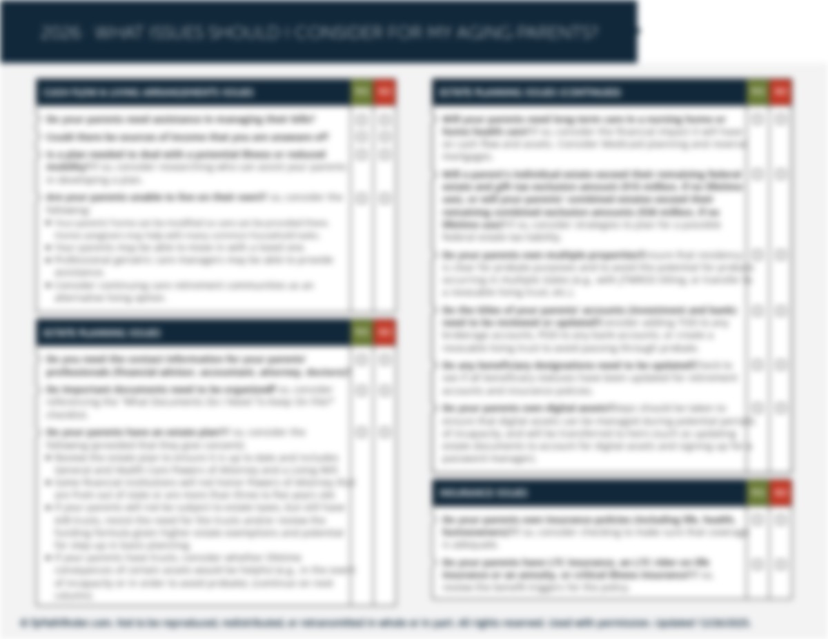 This is a comprehensive checklist of the types of financial issues that advisors should be discussing with their clients who are dealing with aging parents.