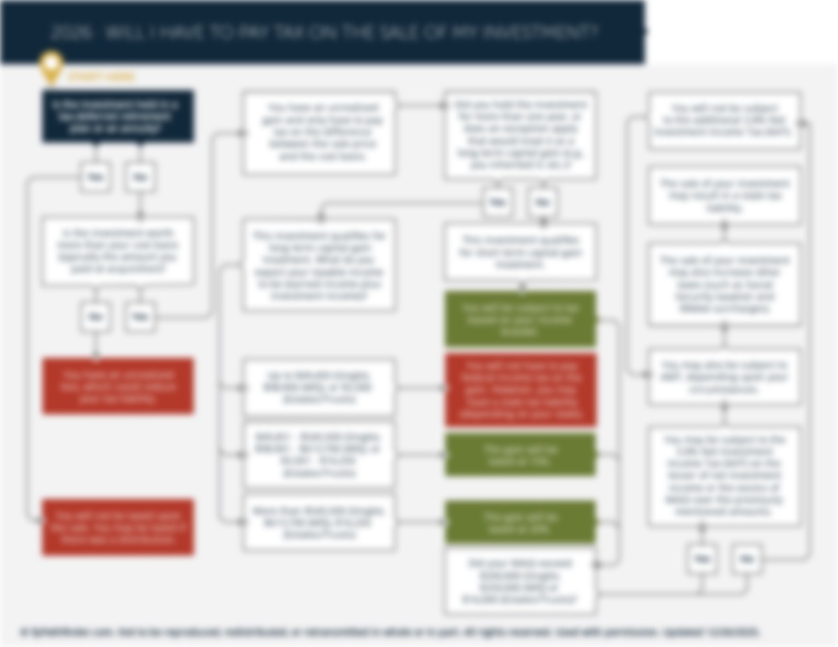 To help make this analysis with clients easier, we have created the “Will I Have To Pay Tax On The Sale Of My Investment?” flowchart. It addresses some of the most common issues that arise for a client trying to understand the tax impact of selling an investment. This flowchart considers the following: