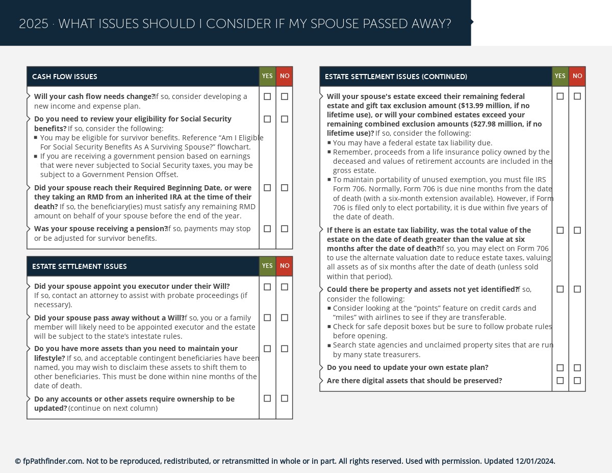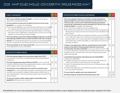 This checklist covers 29 of the most important planning issues to identify and consider for a client whose spouse has recently passed away. It’s structured as follows: