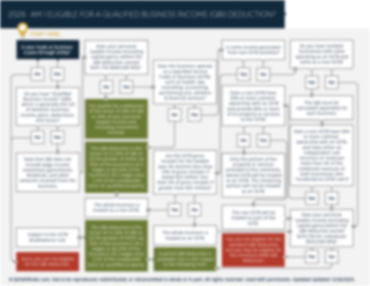 To help make the analysis easier, we have created the “Am I Eligible For A Qualified Business Income (QBI) Deduction?” flowchart. It addresses some of the most common issues that arise for a client trying to understand whether they are eligible for a QBI deduction, including: