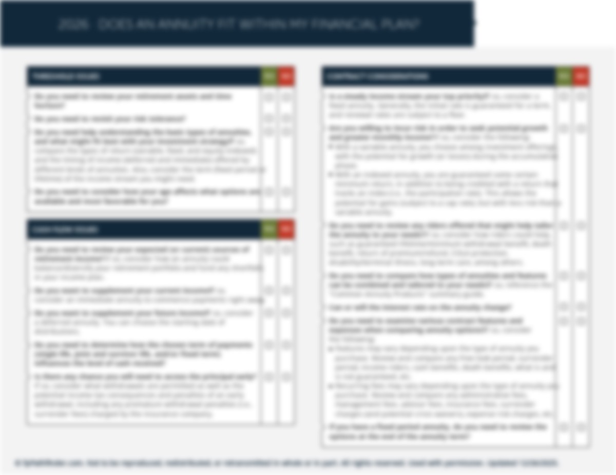 An annuity strategy merits consideration before either being dismissed or implemented. To help you navigate an annuity analysis with your clients, we have created this checklist. It covers key considerations, including: