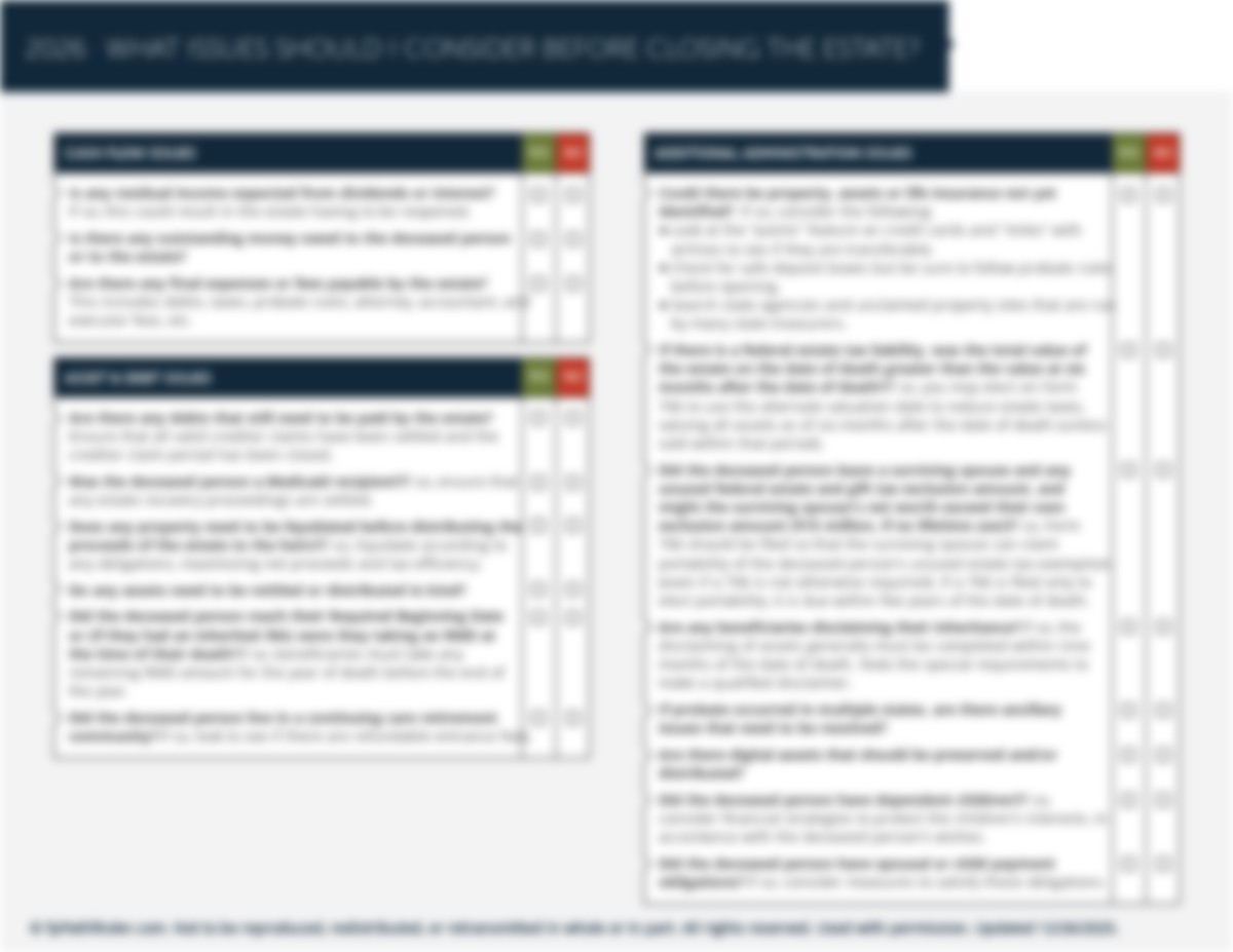 This checklist covers 25 of the most important planning issues to identify and consider before a client closes an estate for a loved one. It’s structured as follows: