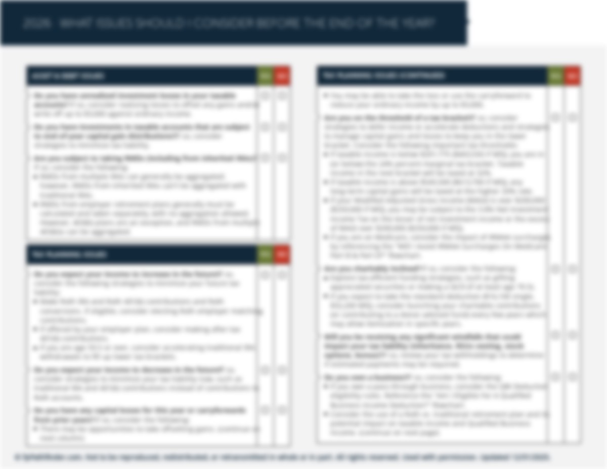 This is a comprehensive checklist of the types of year-end planning issues that advisors should be discussing with their clients to ensure they consider and take advantage of opportunities in the current year and beyond.