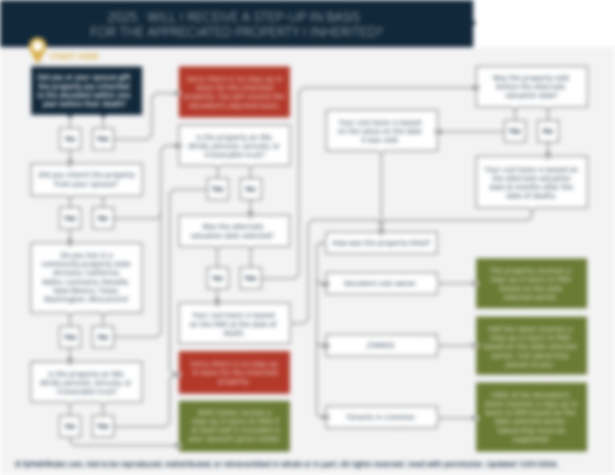 To help make this analysis easier, we have created the “Will I Receive A Step-Up In Basis For The Appreciated Property I Inherited?” flowchart. It addresses some of the most common issues that arise for a client trying to understand their cost basis in property they inherited. This flowchart considers: