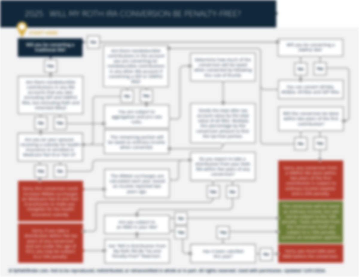 To help make the analysis easier, we have created the “Will My Roth IRA Conversion Be Penalty Free?” flowchart. It addresses common issues that clients encounter when doing a Roth conversion, including: