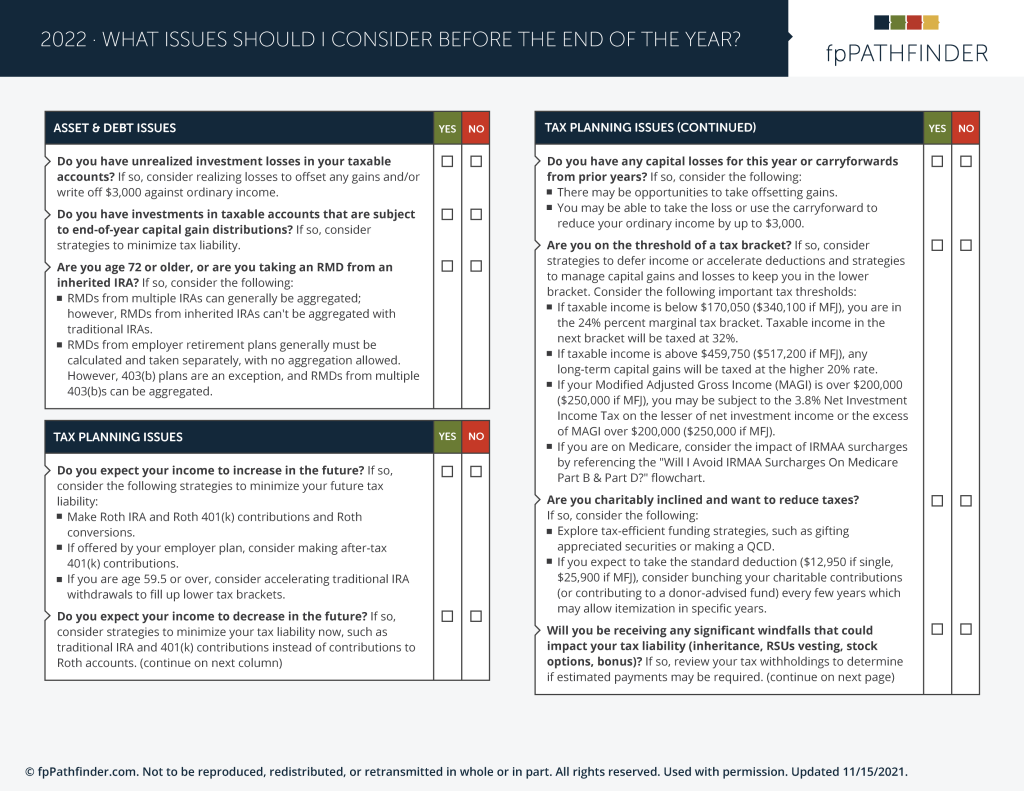 fpPathfinder members have access to the “What Issues Should I Consider Before The End Of The Year?” checklist. If you’d like to have access to this and 100+ other checklists and flowcharts, consider becoming a member. Take a moment to explore the various membership levels and select the one that moves you closer to your goals. If you’d like a personalized experience, register for a live demonstration on the day and time that fits your schedule.
